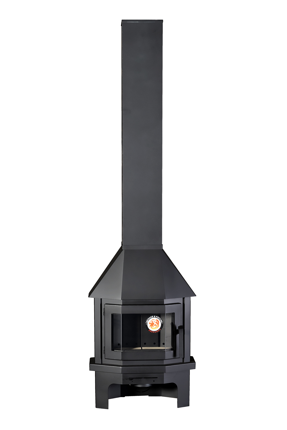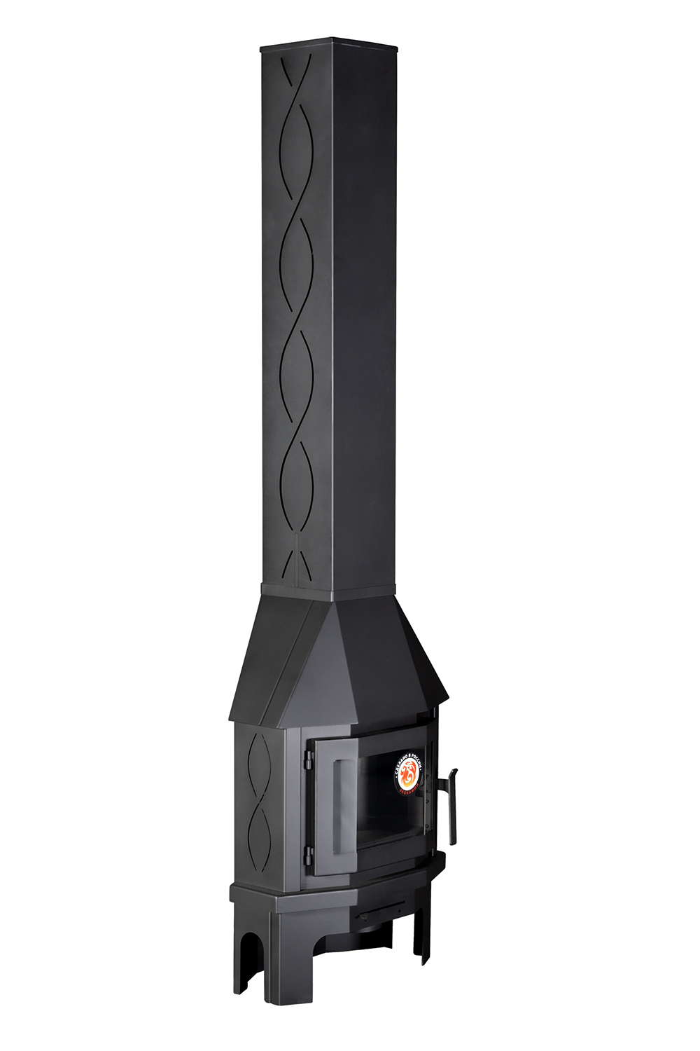 Система подключения дымохода сверху обеспечивает эффективное удаление дымовых газов, а конструкция камеры двойного сгорания обеспечивает высокий КПД в 80%. Габариты камина (ВхШхГ) составляют 2147х600х334 мм, а вес - 64 кг.