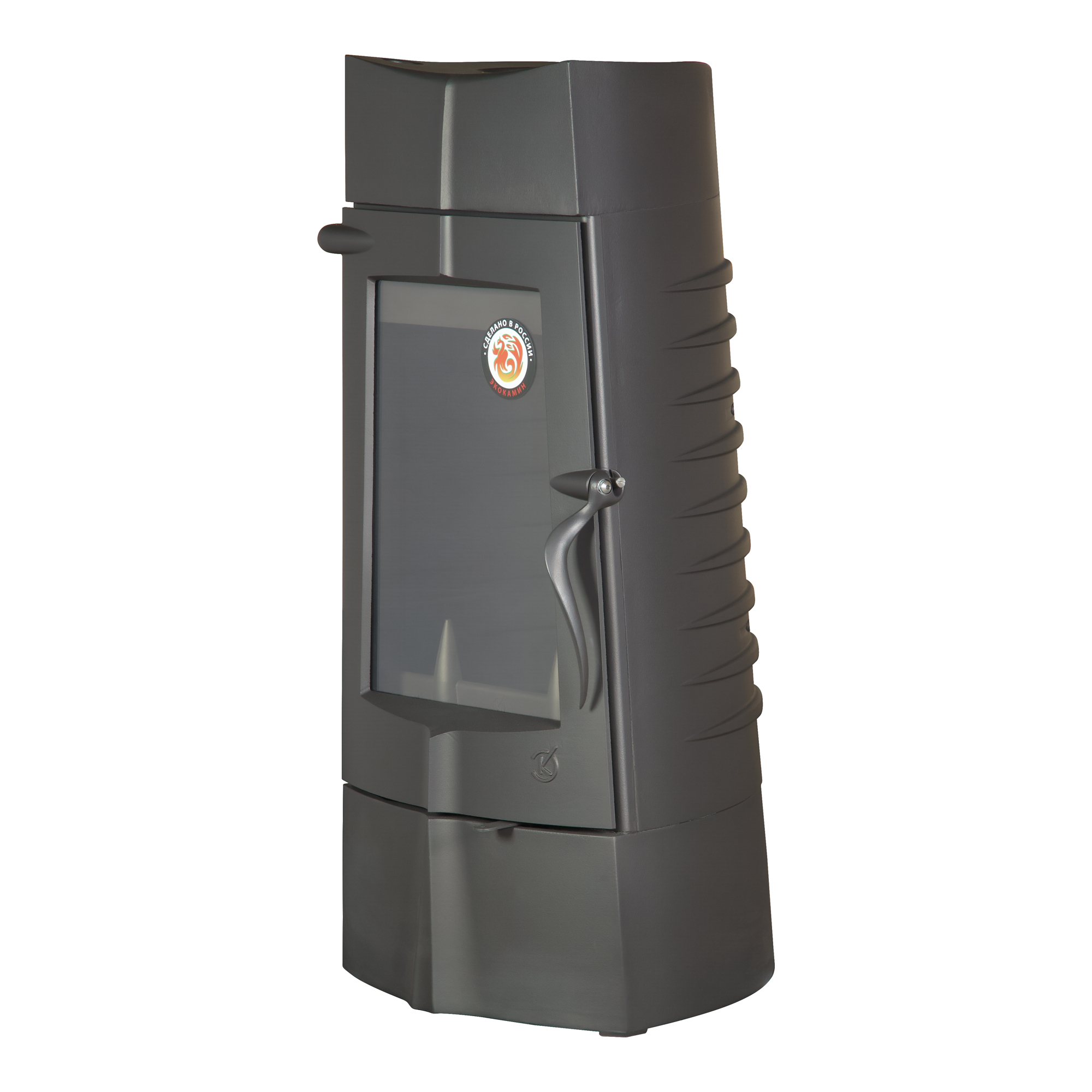 Дверца со стеклом позволяет наслаждаться красивым видом пламени, создавая уютную атмосферу в вашем доме. Подключение дымохода сверху обеспечивает удобство эксплуатации.